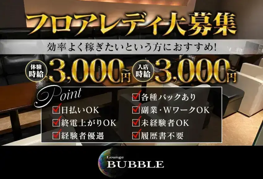 お店のキャスト平均年齢が何と24歳!若くから稼げる、入店初日から稼げるお店として頑張っております。体験入店時は、時給が3,000円と高く設定しているので短時間で高給ゲット!そのほかにも多種多様なバックがあり、「こんなに貰えるのですか?」という方もいらっしゃいます。通勤に関しては駅から近いので安心です。また、初めての方にも働きやすいように【ノルマ・罰金・規則】一切ナシ!自分のペースで働いてください。仕事内容は難しいことはありません、簡単な飲み物を作る、お話しをするがお仕事内容になります。仕事中はドレス着用になりますが、無料レンタルドレスも有り。是非、「Lounge BUBBLE」で私たちと一緒に働いてみませんか?ご応募お待ちしておりまーす!!