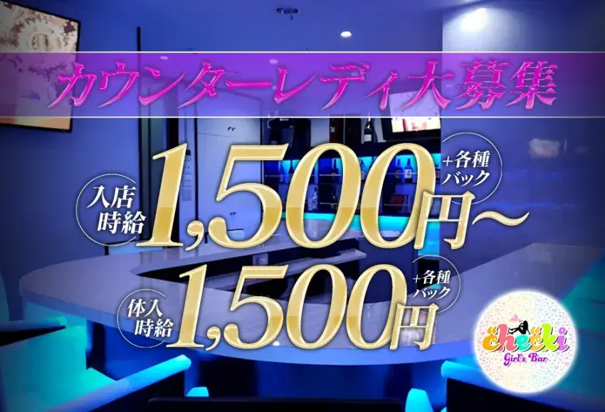 かっこいいデザインのガールズバー『Girl’s Bar checki(ガールズバー チェキ)』です!カウンターレディを大募集中です!特に明るい子、ハイテンション子、ノリノリな子は大歓迎!!ガールズバーなので仕事は全てカウンター内で安心です。接客の経験は無くても大丈夫!今働いている女の子は、20~25歳ぐらいの方がほとんどで皆友達ように楽しく働いています。自信がないと思っている方でも、まずは試しに1日働いてみませんか?レンタル衣装もあるので手ぶらで体入できますよ。軽い気持ちでお問い合わせください。