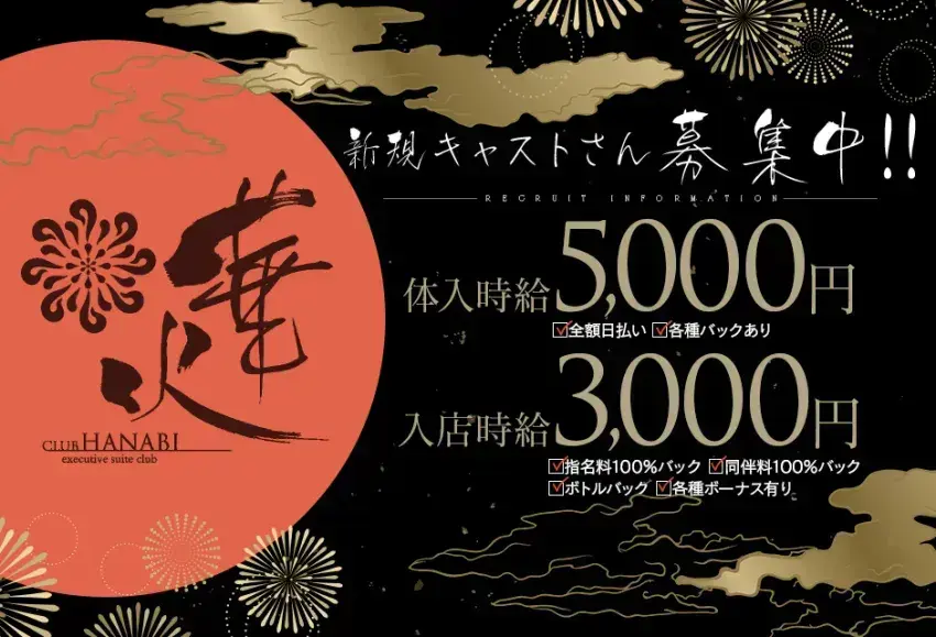 未経験者さんでも安心のお店! 《クラブ華火(ハナビ)》 エリアイチを誇る高待遇で、 驚くほど稼げますよ♪