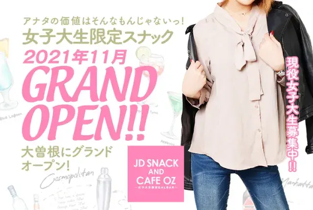 2021年11月11日リニューアルオープン!名古屋市北区の大曽根駅近くに『JD SNACK & CAFE OZ(オズ)』は店を構えております。徒歩3分ほどの駅チカがうれしいスナックです。15年以上の歴史を持つスナックがこの度“女子大生限定”のスナックとして生まれ変わりました!装いも新たにきれいな内装とかわいいJDと一緒に楽しい時間を過ごしませんか?